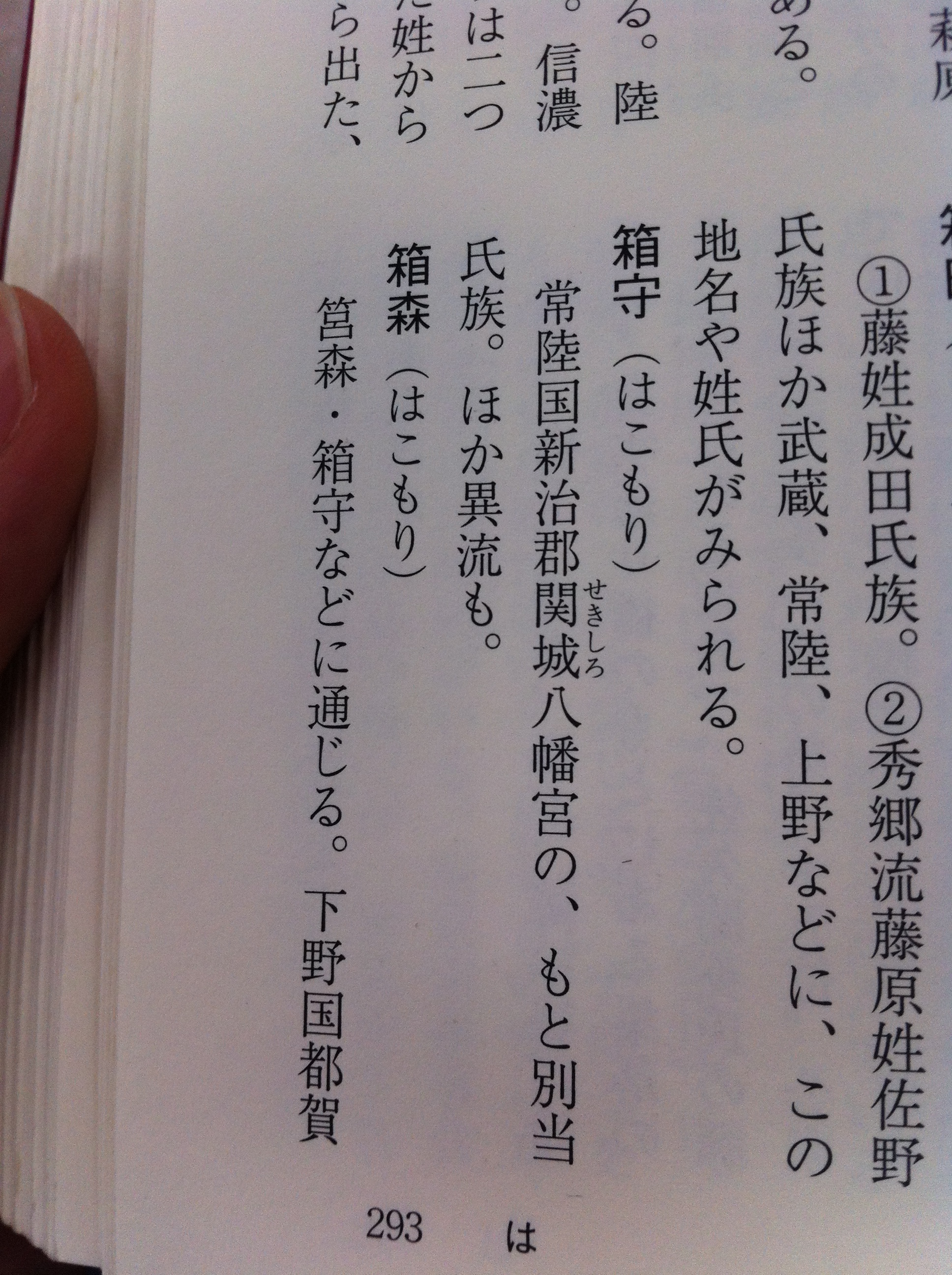 筥森・箱守などに通じる。下野国都賀群箱森より起る族は秀郷流藤原姓、ほか異流が多い。